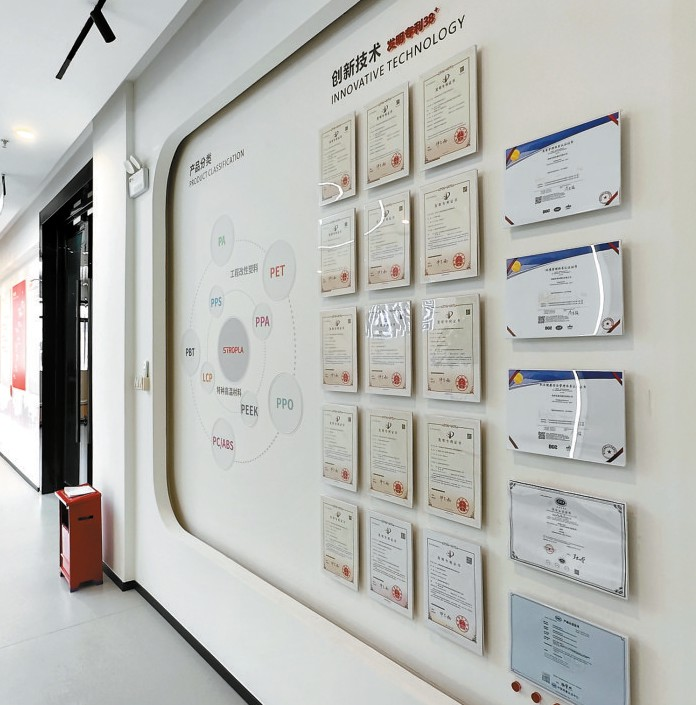 企业研发大楼三楼的荣誉墙上挂满了牌匾,“国家专精特新‘小巨人’企业”“国家高新技术企业”“国家科创型企业”“广东省工程技术研究开发中心”“深圳市高分子材料行业协会理事单位”“深圳市中小企业发展促进会理事单位”……每一块牌匾,都诉说着专注的力量与诚信的价值。